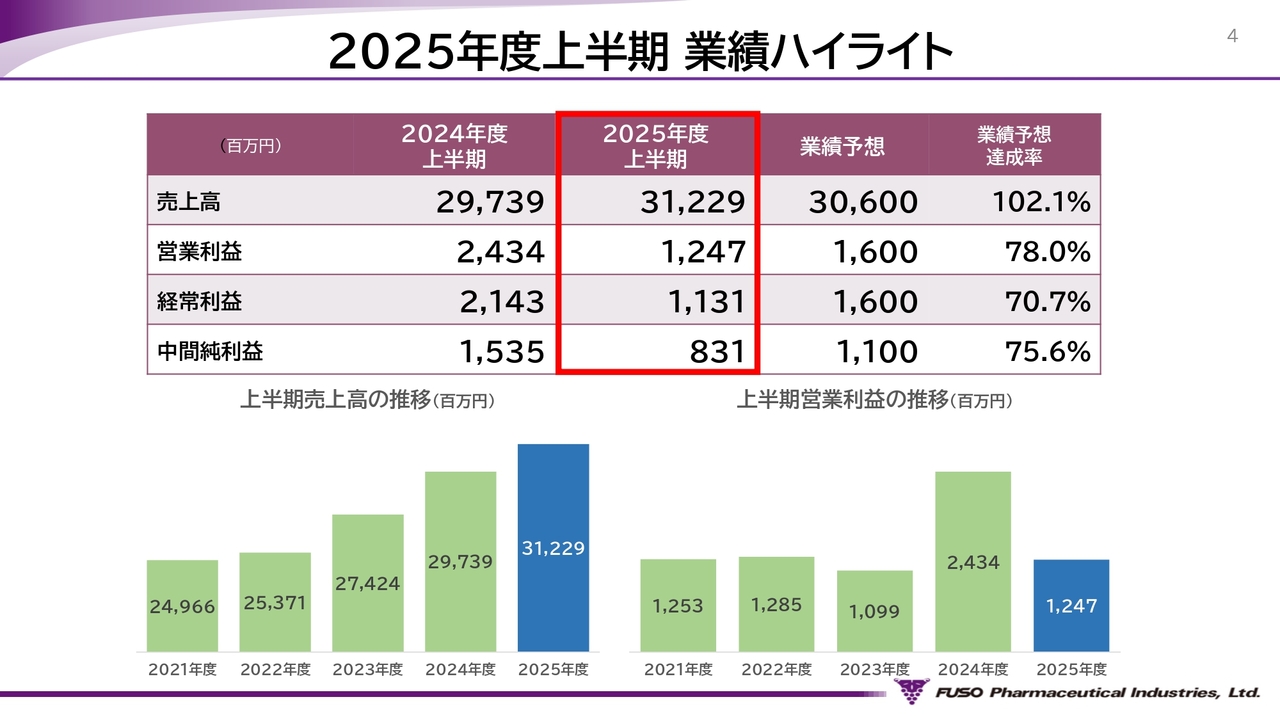 上半期実績と業績予想との比較および上半期売上高・営業利益の5年推移をお示しします。