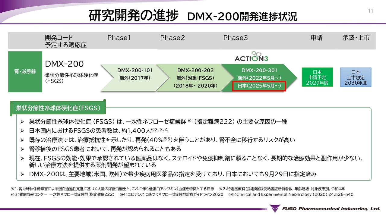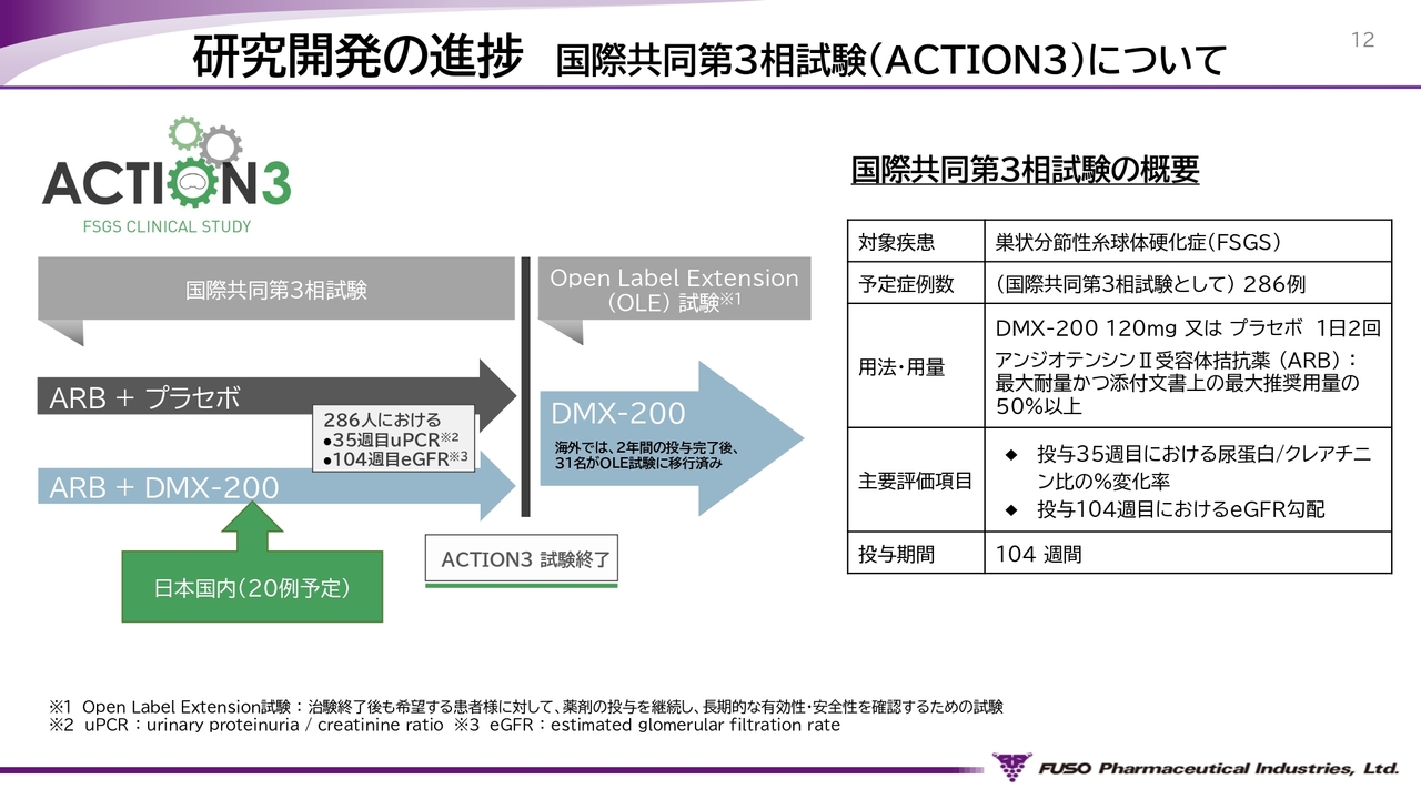 「ACTION3」は、プラセボを対照としたDMX-200の二重盲検比較試験で、予定症例数は286例、投与期間は104週間、主要評価項目は投与35週目における尿蛋白/クレアチニン比のパーセント変化率および投与104週目におけるeGFR勾配です。