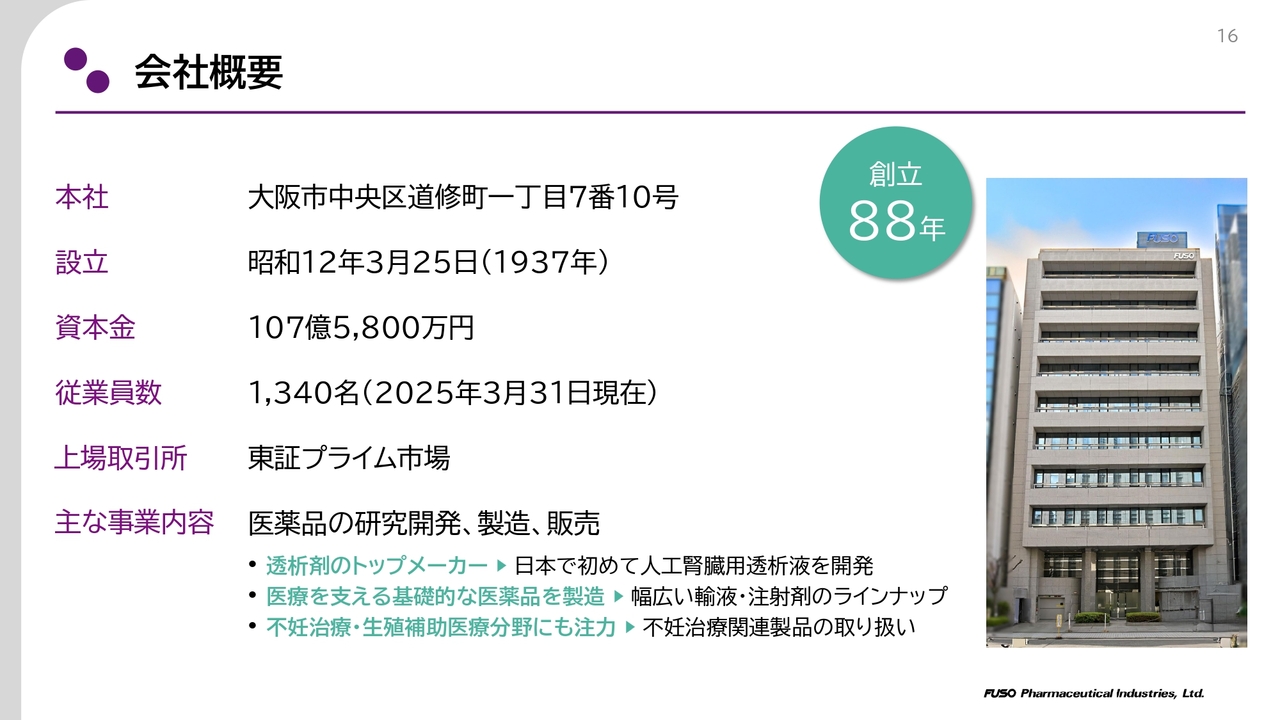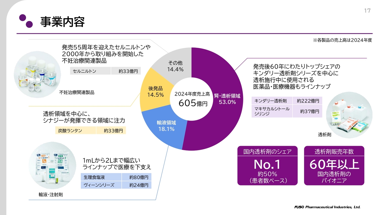 日本で初めて人工腎臓用透析液を開発した透析剤のトップメーカーであること、透析関連医薬品をはじめ、輸液・注射剤など、医療に不可欠とされる基礎的医薬品を多く製造販売する、日本有数の基礎的医薬品メーカーであること、そして、不妊治療・生殖補助医療分野にも注力していること、これらが、当社の大きな特徴です。