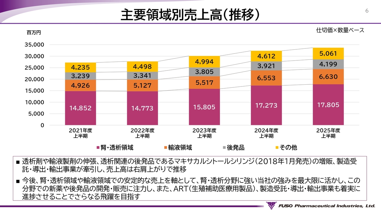 透析剤や輸液製剤の伸張、2018年1月に発売した透析関連の後発品である「マキサカルシトールシリンジ」の増販、製造受託・導出・輸出事業が牽引し、売上高は右肩上がりで推移しています。