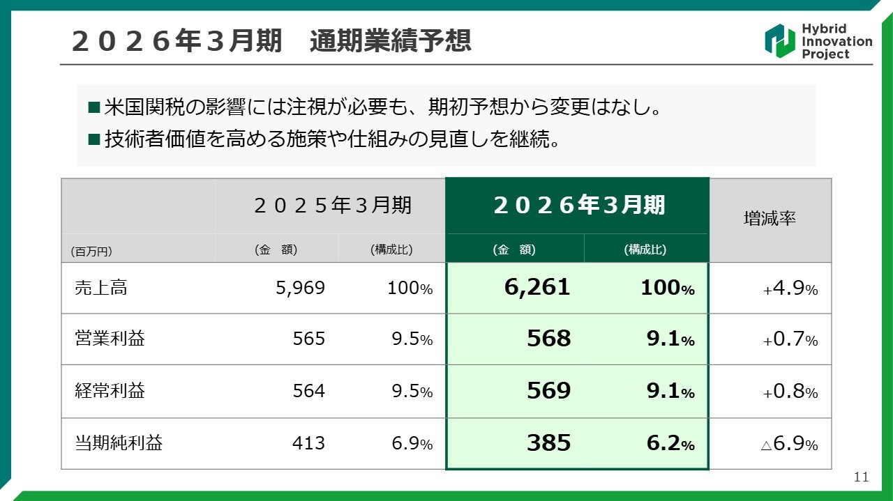 続いて、2026年3月期通期の業績予想についてご説明します。通期の業績予想は期初に開示した数字から変更はありません。売上高は前期比4.9パーセント増の62億6,100万円、営業利益は前期比0.7パーセント増の5億6,800万円、経常利益は前期比0.8パーセント増の5億6,900万円、当期純利益は前期比6.9パーセント減の3億8,500万円としています。