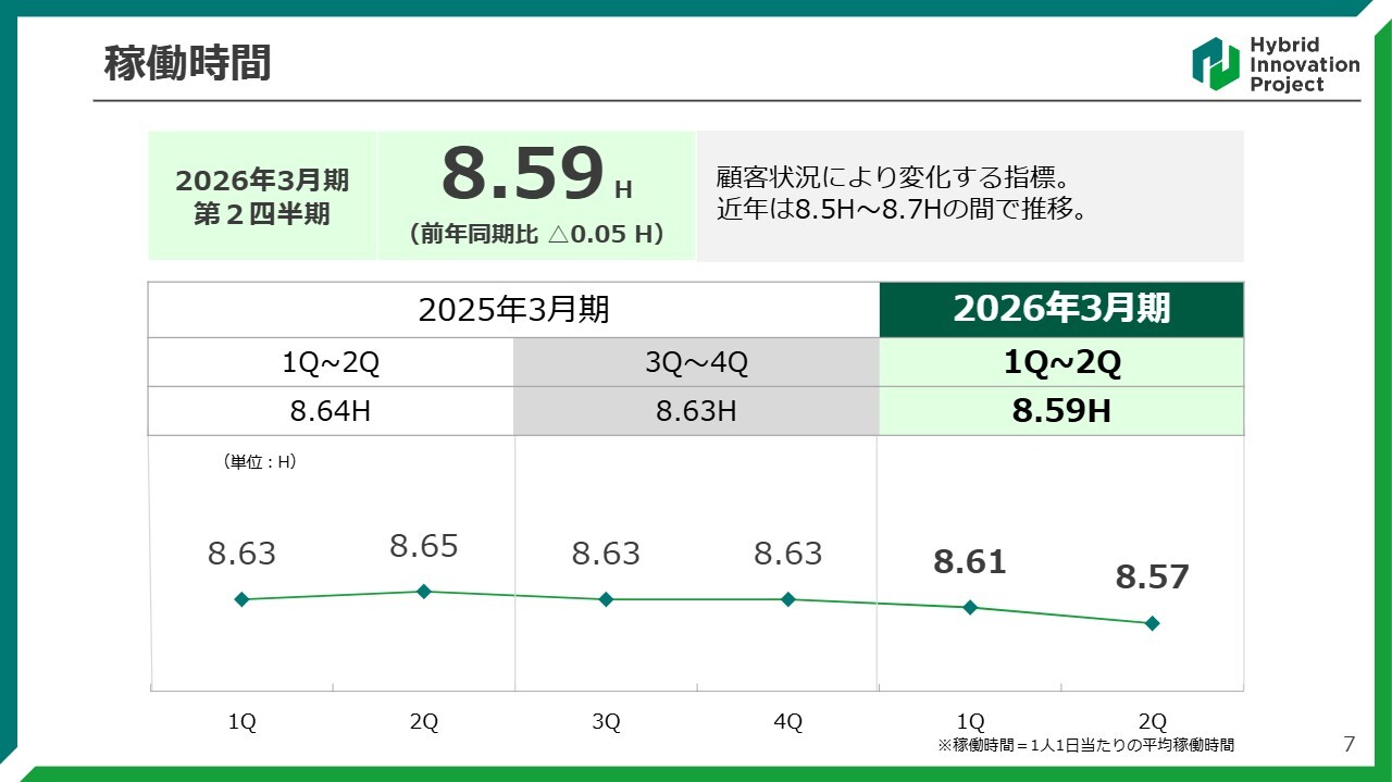 1日当たりの平均稼働時間は第2四半期で8.59時間となり、前年同期比で0.05時間減少しました。稼働時間は顧客の開発スケジュールや働き方によって変動するため、当社では統制が難しいものですが、売上高を構成する重要な指標です。