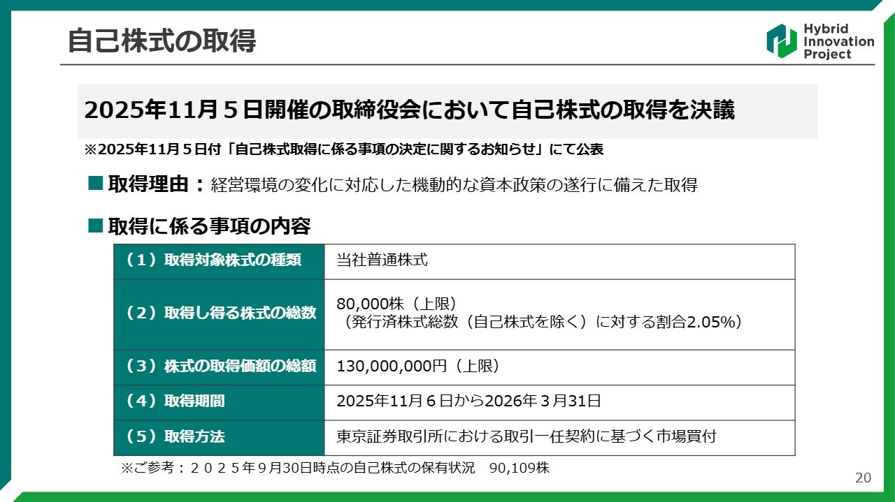 最後に、株主還元についてご説明します。当社は、11月5日に開催した取締役会で自己株式の取得を決定しました。その理由は、経営環境の変化に対応した機動的な資本政策に備えるためです。2026年3月31日までに8万株、1億3,000万円を上限に買い付けを行う予定です。