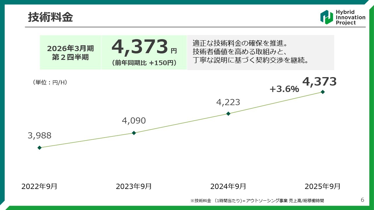技術料金は、第2四半期に4,373円となり、前年同期比で150円、3.6パーセント増加しました。2022年との比較では約10パーセント上昇しています。当社では、適正な技術料金の確保を推進しており、サービスの質および技術者のスキル向上を図りながら、契約更新や業務内容が変わるタイミングでお客さまと交渉を行っています。