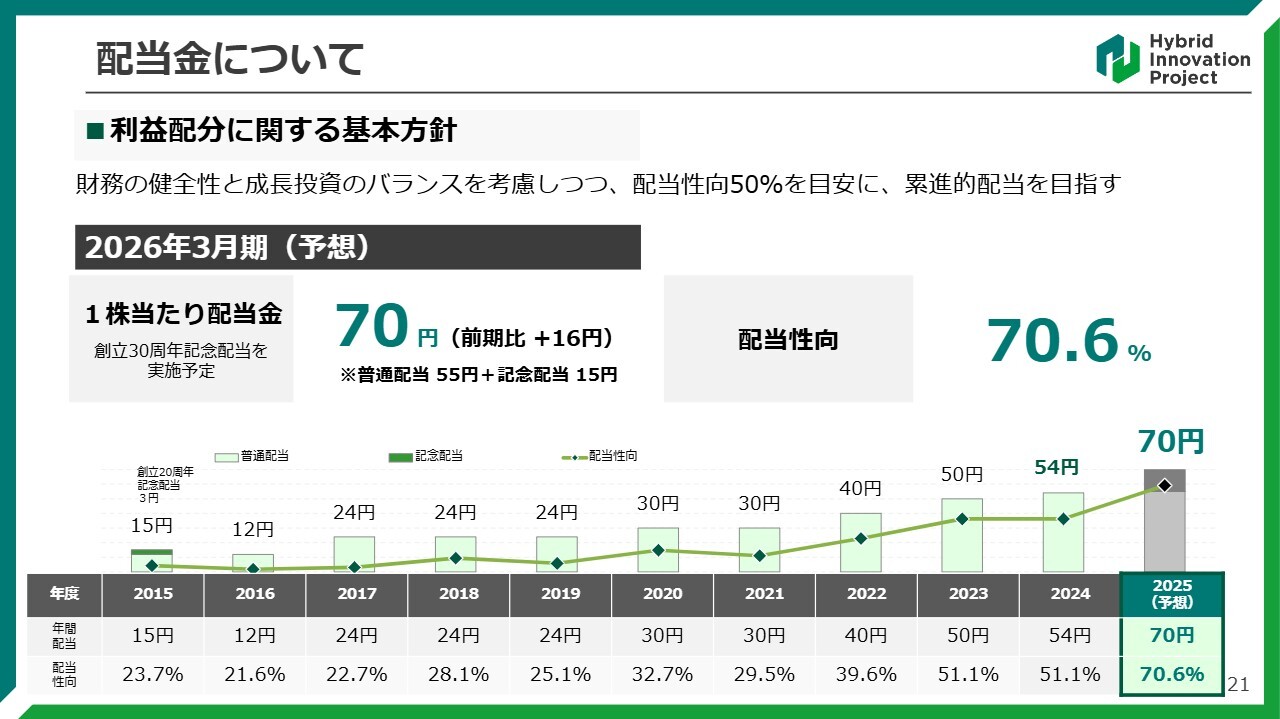当期の配当は、当社が創立30周年を迎えたことと、支えていただいた株主のみなさまへの感謝の意を込めて、1株当たり普通配当55円に記念配当15円を加えた70円を予定しています。前期から16円の増配となり、配当性向は70パーセントを超える予定です。