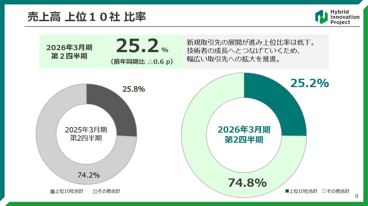 売上高の上位10社の比率です。今期は25.2パーセントで、前年同期から0.6ポイント減少しました。当社では、特定の顧客に偏ることなく、幅広い取引を目指しています。この方針には、2つのメリットがあります。