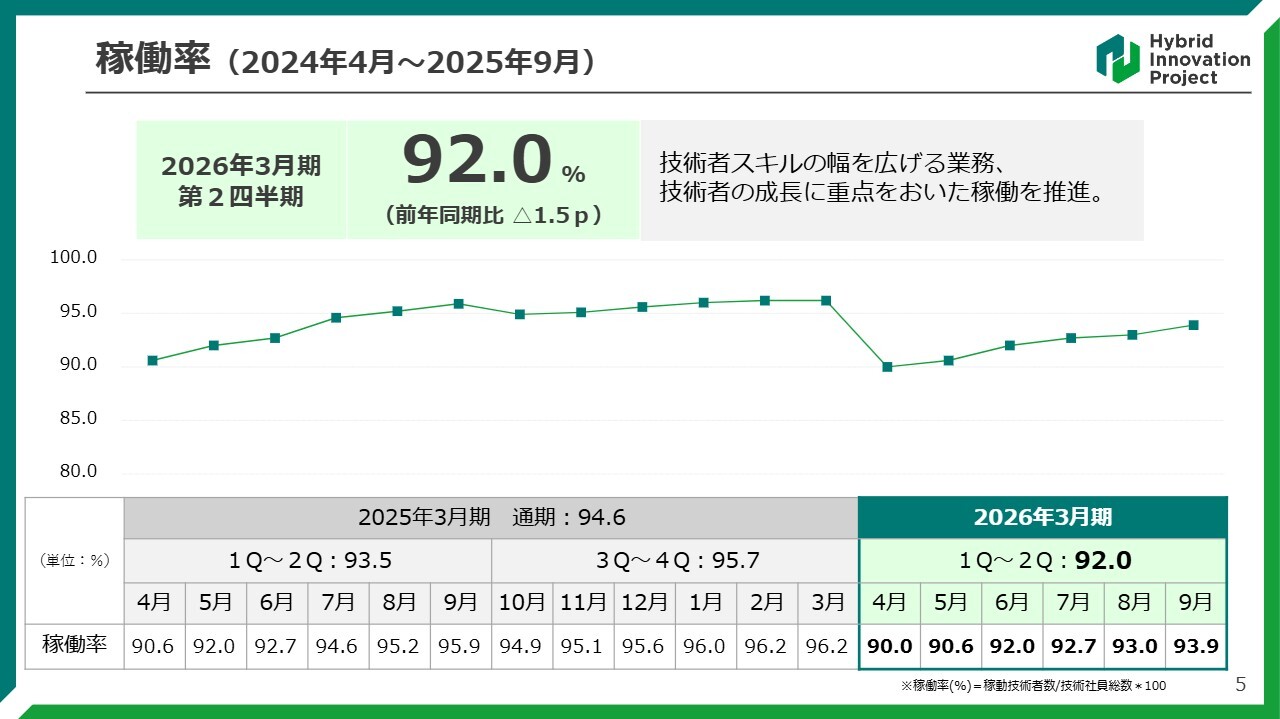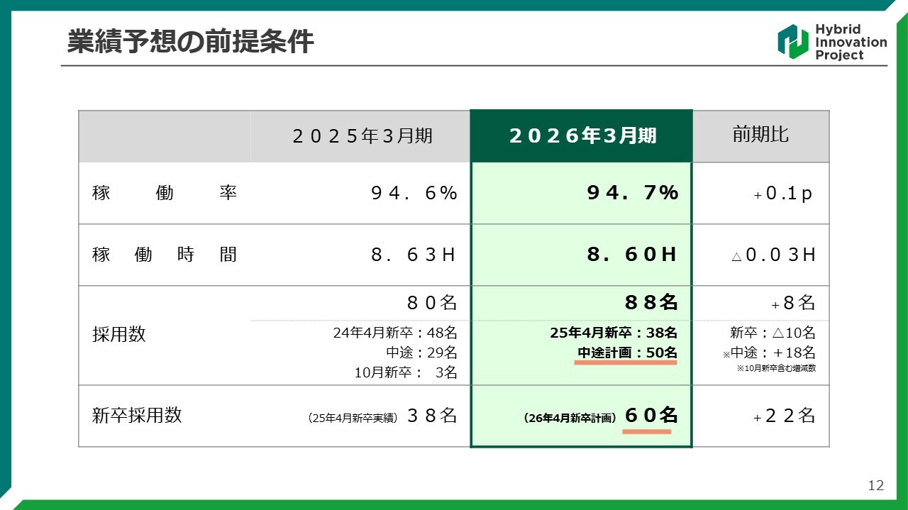 稼働時間はおおむね例年並みです。また、採用については、中途採用を50名、2026年新卒採用を60名計画しています。環境の変化に対応しながら、技術者にとって魅力的な環境をしっかり整え、採用計画を達成したいと考えています。