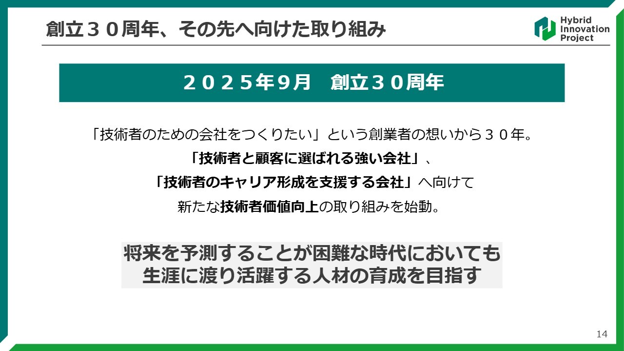 「技術者のための会社をつくりたい」という創業者の思いから30年が経ち、会社を新たなステージへ進めていくために、昨年から「技術者と顧客に選ばれる強い会社」、そして「技術者のキャリア形成を支援する会社」へ向けて技術者価値の向上に取り組んでいます。