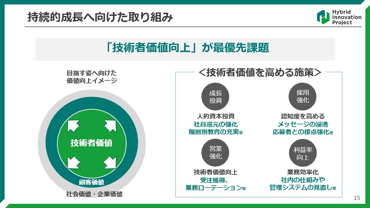 スライド右側の図は、技術者価値の向上に向けた具体的な取り組みです。主に4つの施策を展開しています。1つ目は、成長投資として引き続き人材に投資していくことです。繰り返しお伝えしているとおり、社員の処遇改善もその1つです。また、教育にも十分に投資し、技術者がさらに成長できるプラットフォームをしっかりと構築していきます。