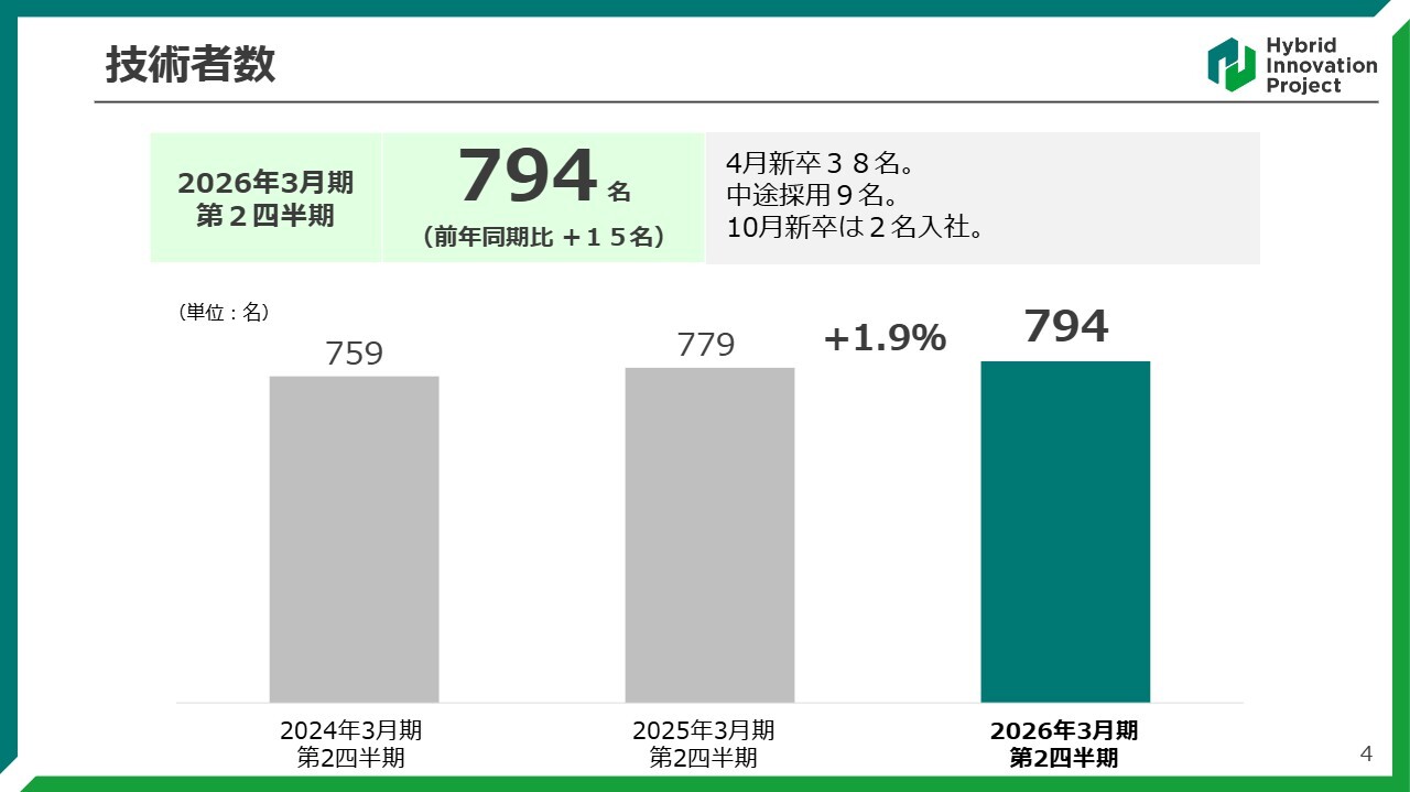 当社事業に関わる指標についてご説明します。技術者数は第2四半期末で794名となり、前年同期から15名、1.9パーセント増加しました。
