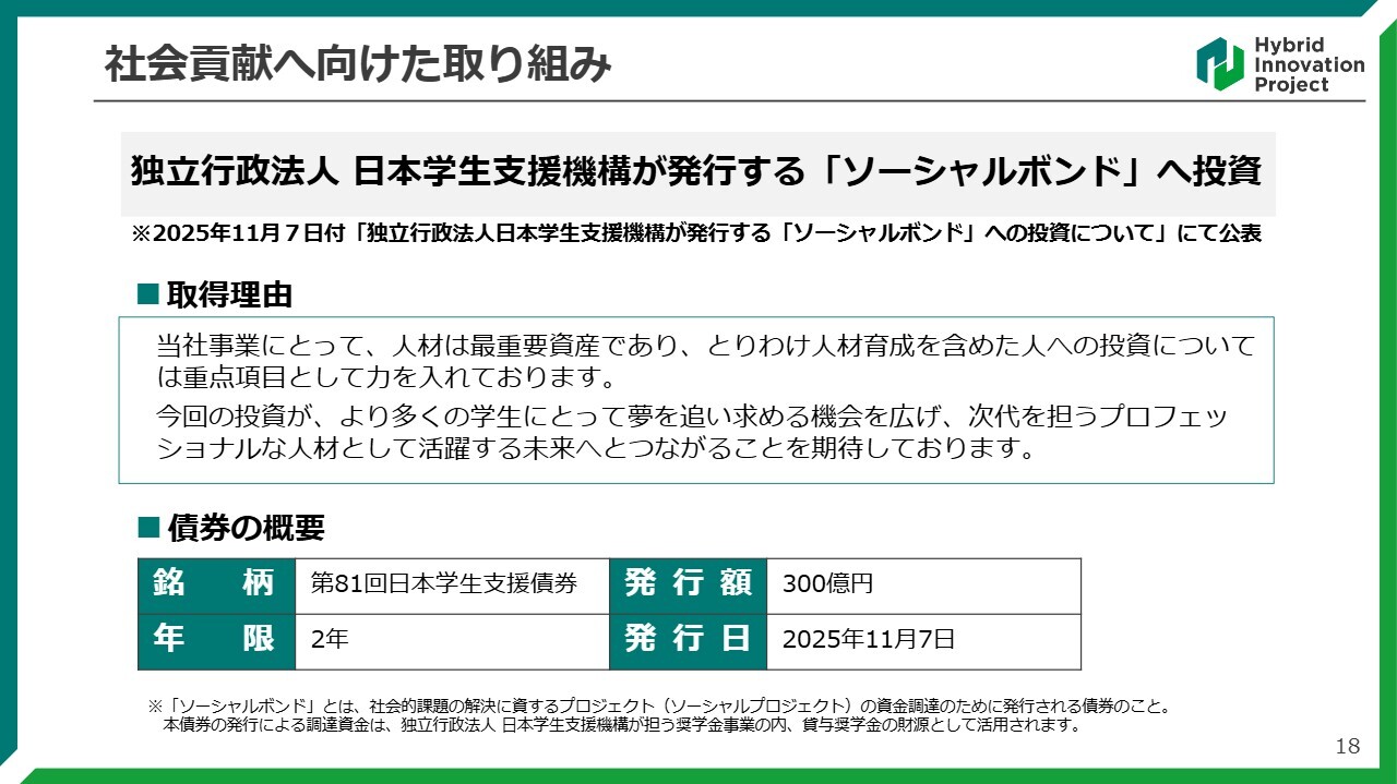 また、社会貢献に向けた取り組みも行っています。今回が初めての取り組みとなりますが、独立行政法人日本学生支援機構が発行する「ソーシャルボンド」への投資を決定しました。
