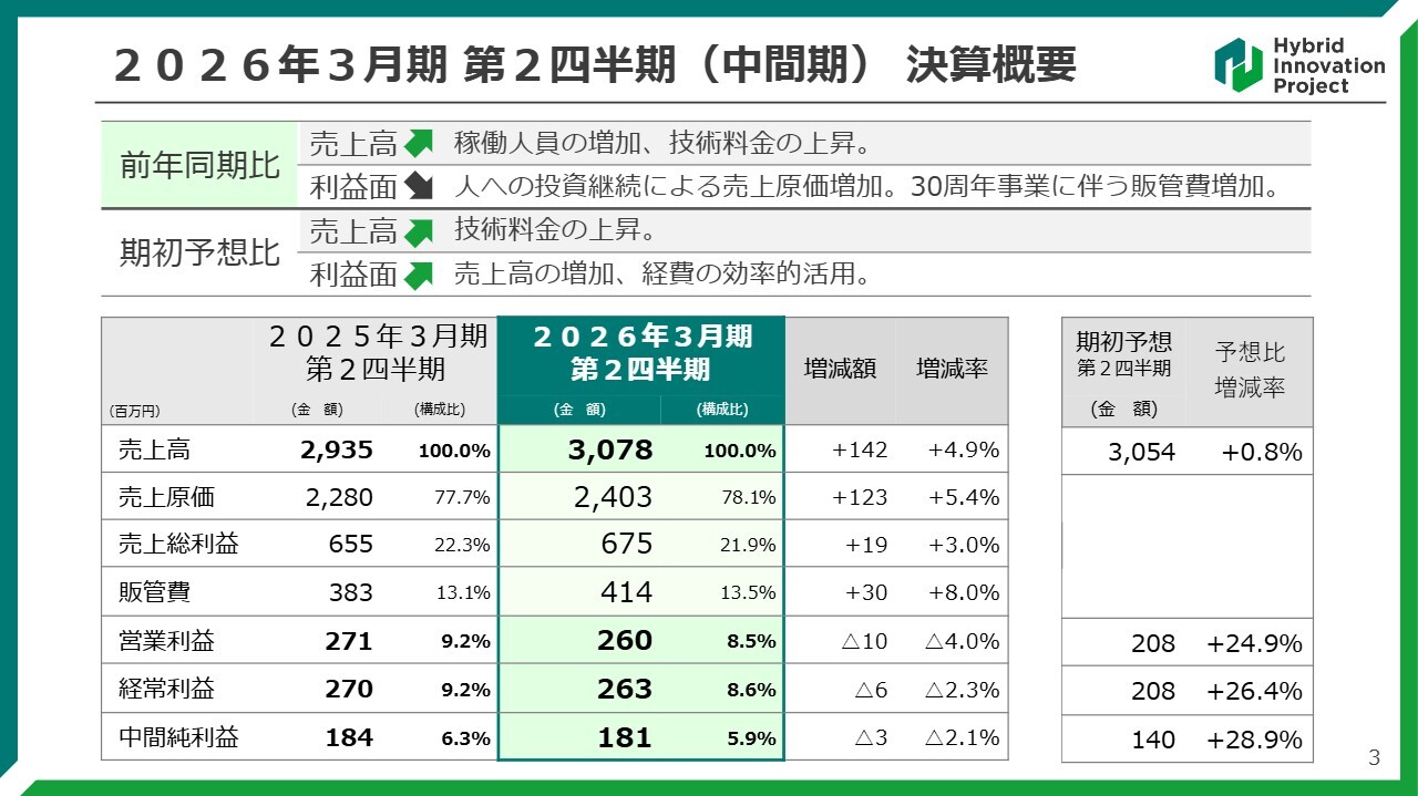 売上高の増加要因は、稼働人員の増加と技術料金の上昇です。利益面の減少要因は、社員の処遇改善を含めた人への投資の継続による売上原価の増加や、30周年事業に伴う広告宣伝費や福利厚生費などの販管費の増加です。