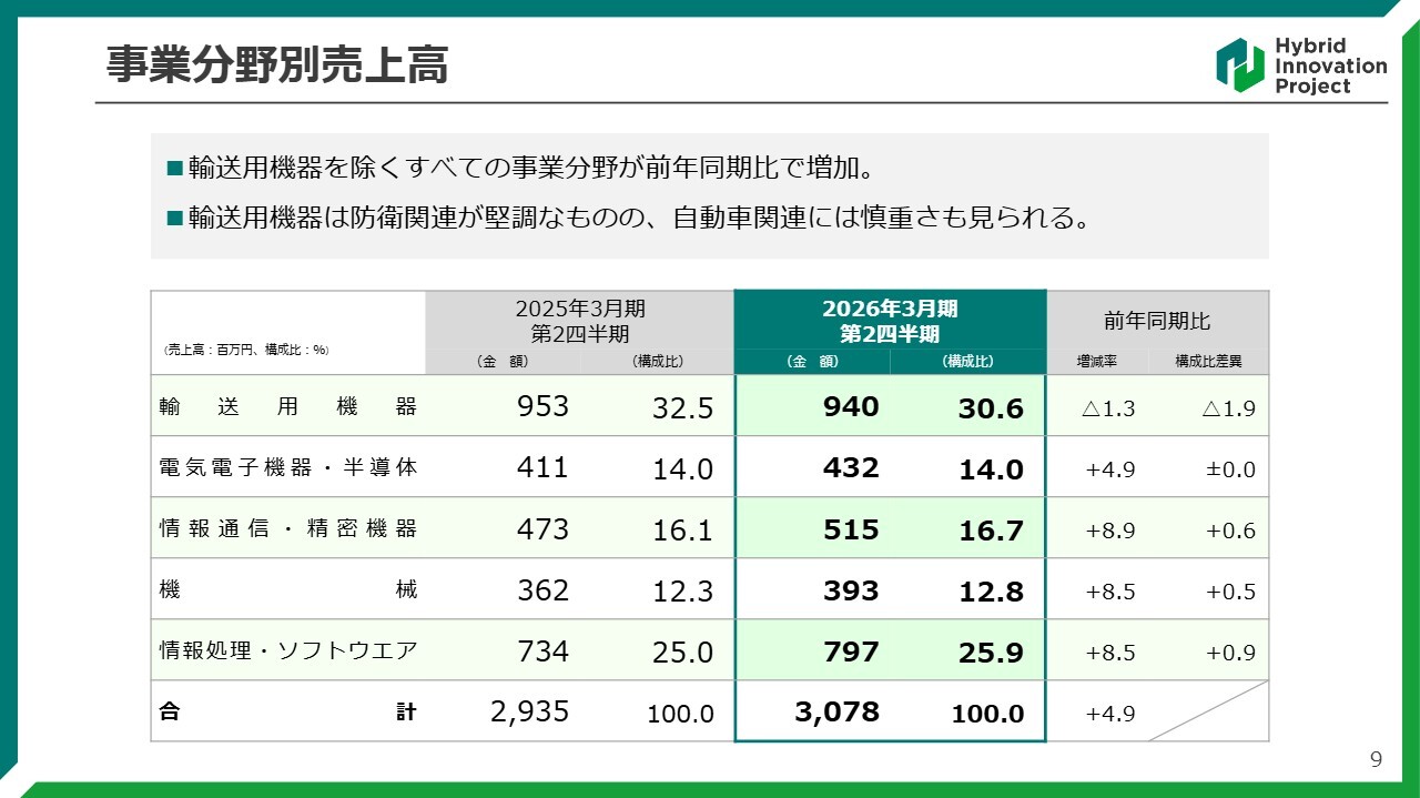 事業分野別の売上高です。輸送用機器以外のすべての事業分野で増加しました。輸送用機器では、防衛関連が堅調である一方で、自動車関連においては、一部のお客さまに慎重な姿勢が見られる状況です。ただし、将来を見据えた投資は継続されているため、当社としてもしっかりと提案を進めていきたいと考えています。