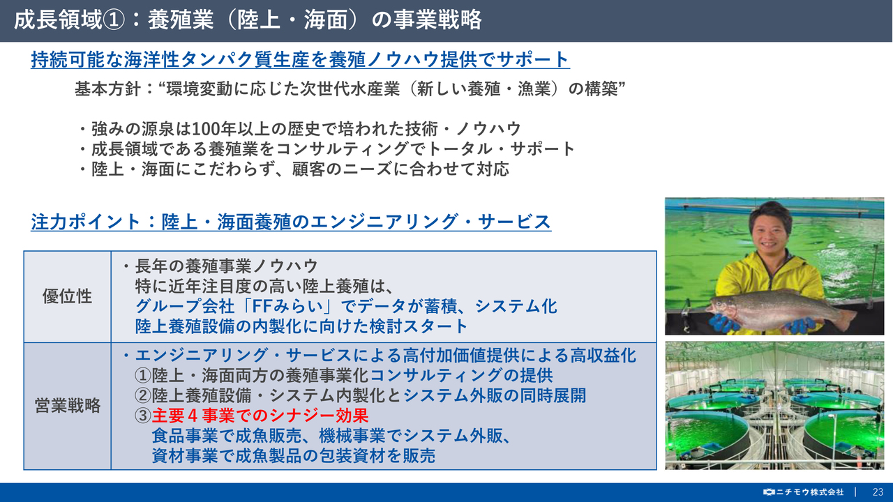 長年養殖に携わってきたノウハウを活かし、海面・陸上の双方の養殖手法において高付加価値化に向けたコンサルティングを展開していくことと、陸上養殖施設の運営を安定化させて増産していくことに加えて、当社独自の陸上養殖システムを確立し販売していくことが、主な事業戦略となります。