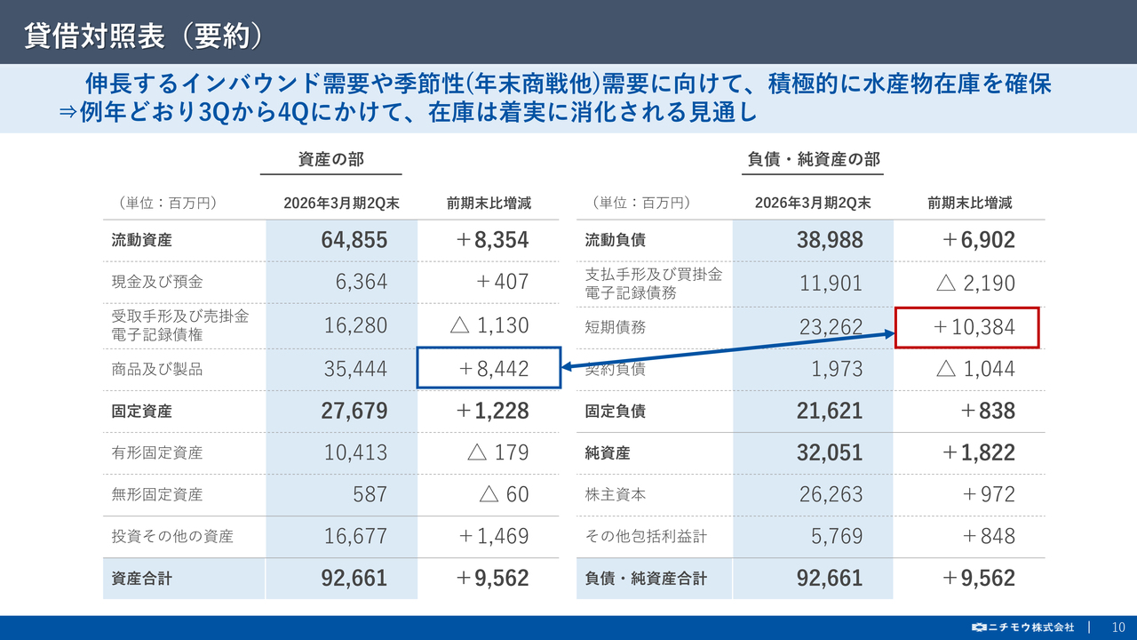 まずはじめに、資産の部が前期末比で増加した主な要因は、例年同様、年末商戦に向けて在庫を多く積み増したことなどにより、「商品および製品」が大幅に増加したためです。