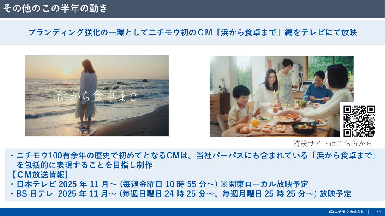 先ほど説明会の冒頭でCMをご覧いただきましたが、当社のパーパスに含まれる「浜から食卓まで」を包括的に表現することを目的としており、CMは15秒、30秒、60秒の全部で3本を製作しました。