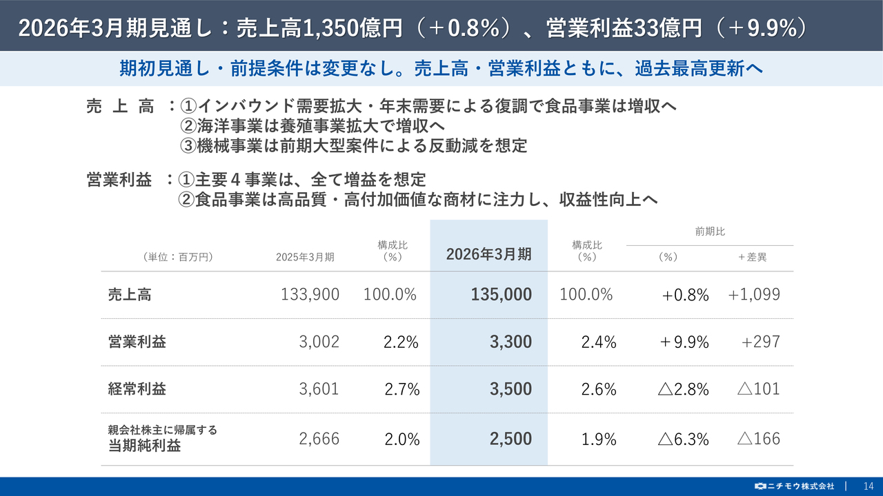 2026年3月期見通し:売上高1,350億円(+0.8%)、営業利益33億円(+9.9%)