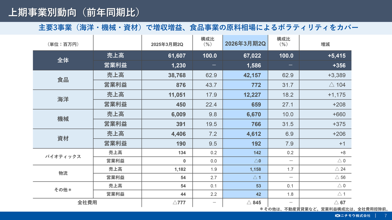 先にご説明のとおり、主要4事業の全てで増収、利益面は、食品を除く3事業で増益となり、水産業界を主軸としながら、その周辺領域で多角化された当社の事業展開により、食品事業の原料相場によるボラティリティの影響をカバーする結果となりました。
