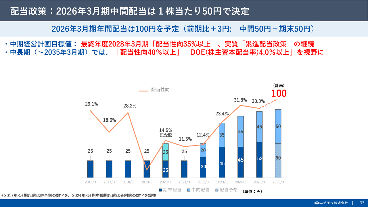 また、現中計の配当方針は、実質累進配当政策を維持することに加え、「配当性向35パーセント以上」をコミットしていますので、早期達成できるよう努めていきます。