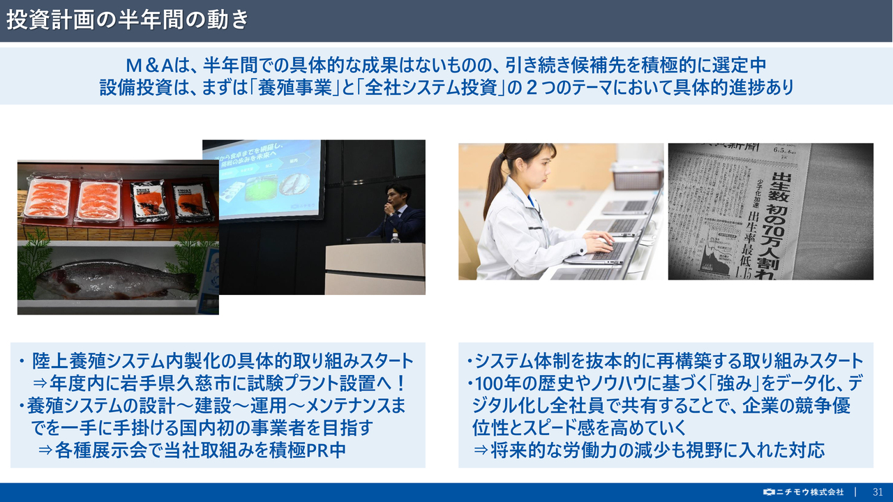投資計画の半年間の動きとして、まず左のスライドの養殖事業についてですが、当社独自の陸上養殖システムの確立に向けた具体的な取り組みがスタートしました。
