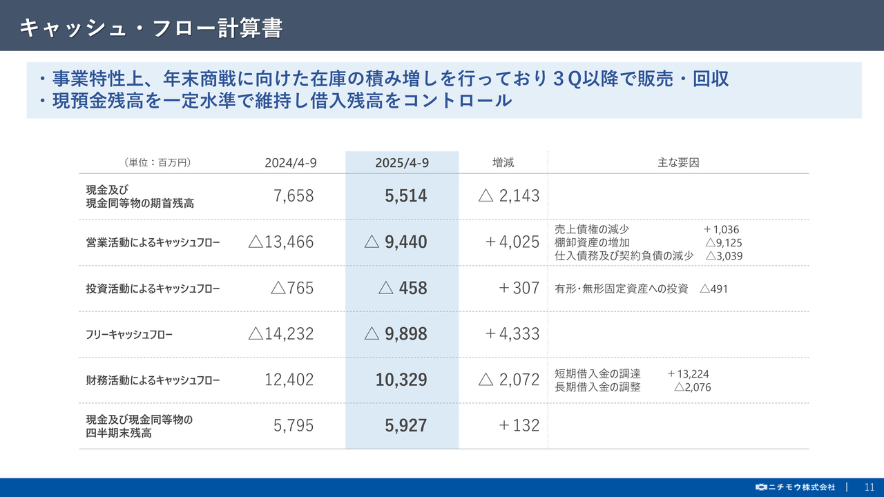営業活動によるキャッシュ・フローについては、先にも述べましたとおり、当社の事業構造上、年末商戦に向けて水産物の在庫を春先から手当てする必要があり、第2四半期時点まで棚卸資産が増加します。