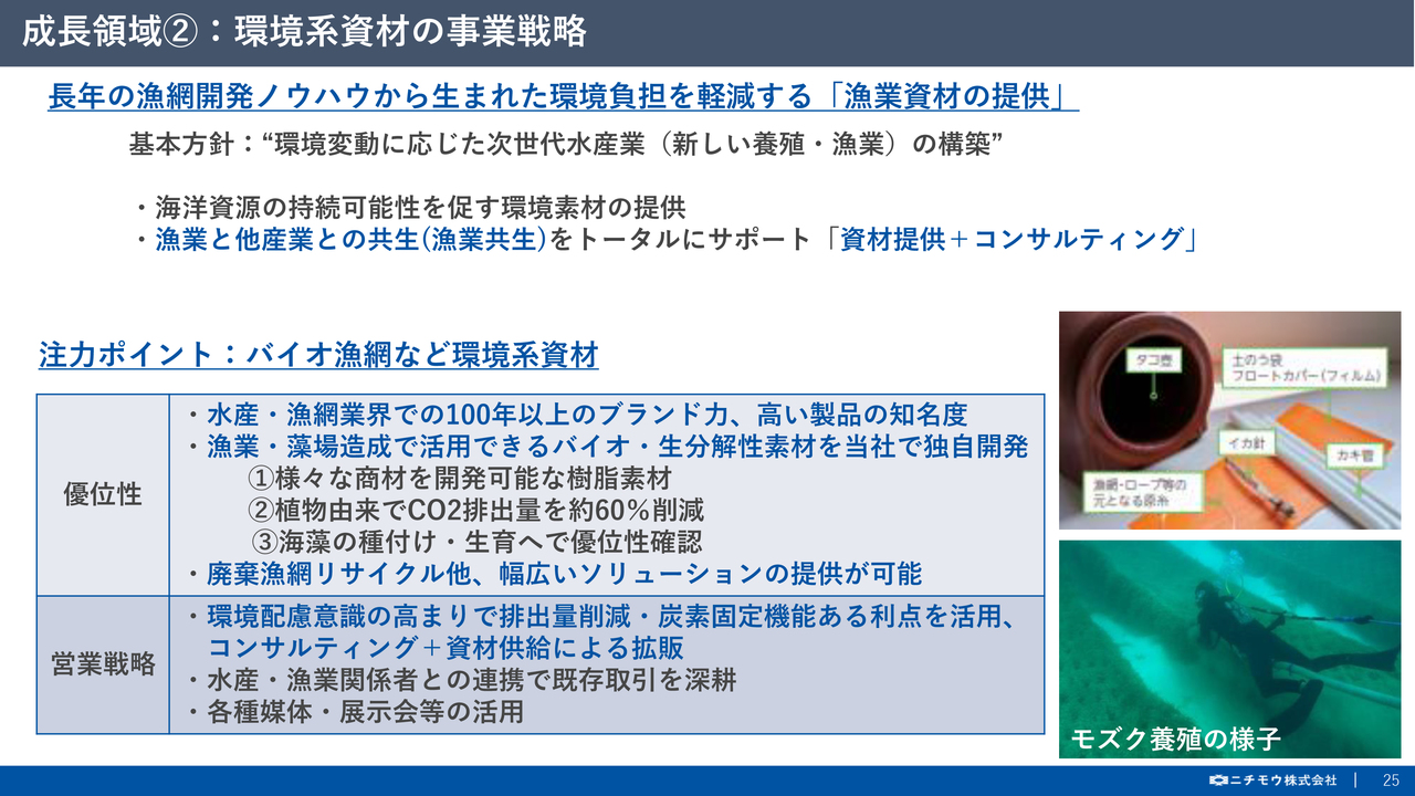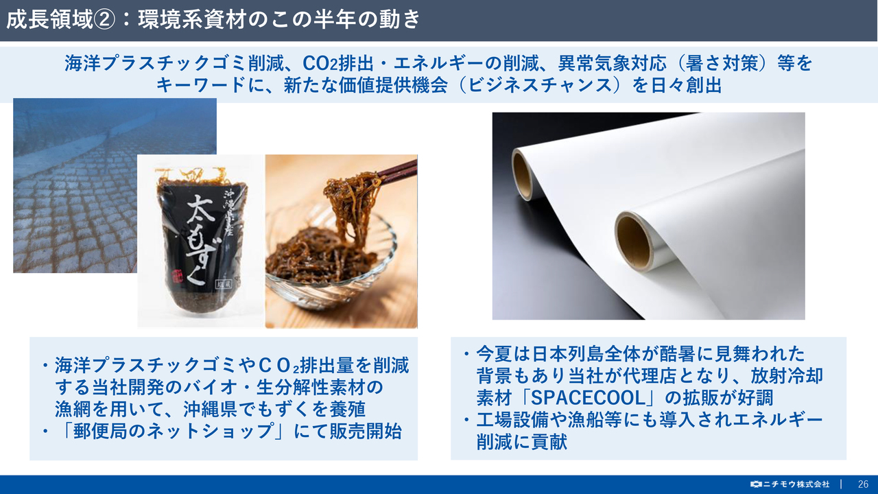 環境系資材の半年間の動きとしては、まず、当社開発のバイオ・生分解性素材の養殖網を用いた沖縄県でのもずく養殖が進展しました。