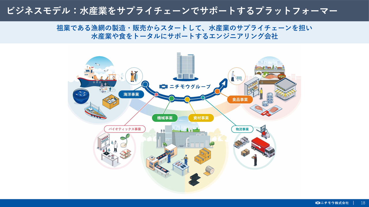 浜から食卓までを網羅する主要の海洋、機械、資材、食品の4事業と、バイオ、物流を加えた全6事業が関わることで、水産物の漁獲・加工・流通・販売のサプライチェーンをトータルにサポートするエンジニアリング会社として、唯一無二のビジネスモデルを構成しています。