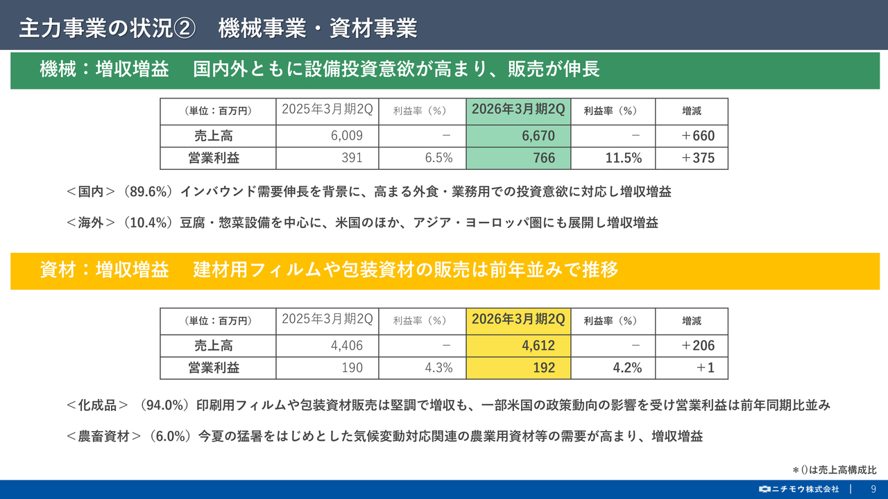 最後に、資材事業ですが、化成品において一部米国の政策動向の影響を受けたものの、印刷用フィルムや包装資材販売は堅調に推移し、農畜資材においても、猛暑など気候変動に対応した農業用資材の需要が高まった結果、増収増益となりました。