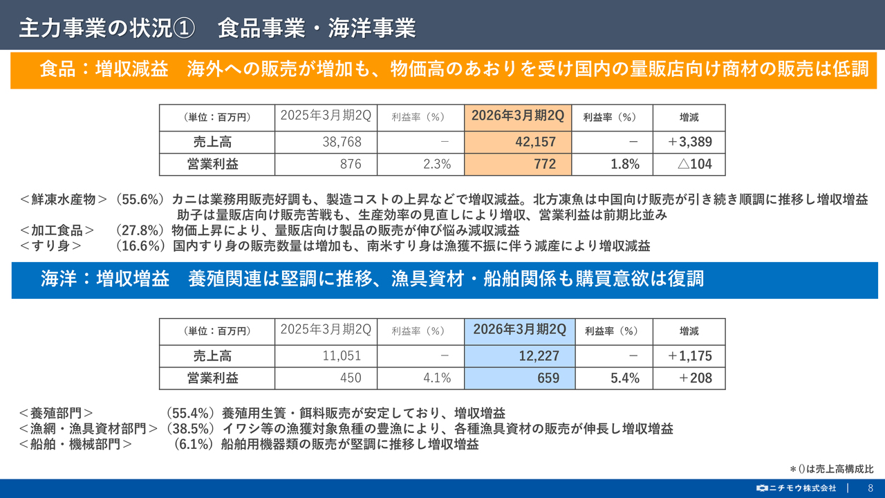 まず、はじめに食品事業ですが、中国向けの凍魚販売が順調に推移し海外展開が進みましたが、物価上昇等により各種製品の国内量販店向けの販売が伸び悩み、すり身についても、南米における漁獲不振による減産が影響した結果、増収減益となりました。