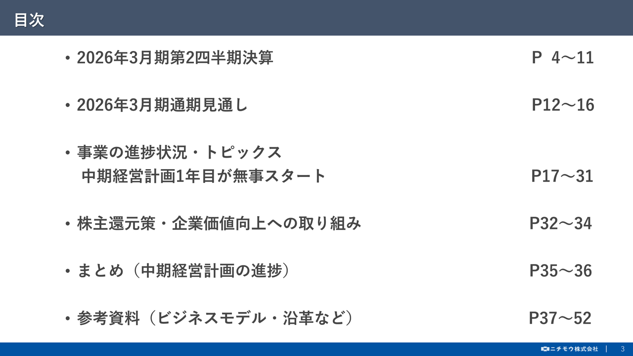 また、ご覧の目次に沿ってご説明します。では、2026年3月期第2四半期の決算についてご説明します。
