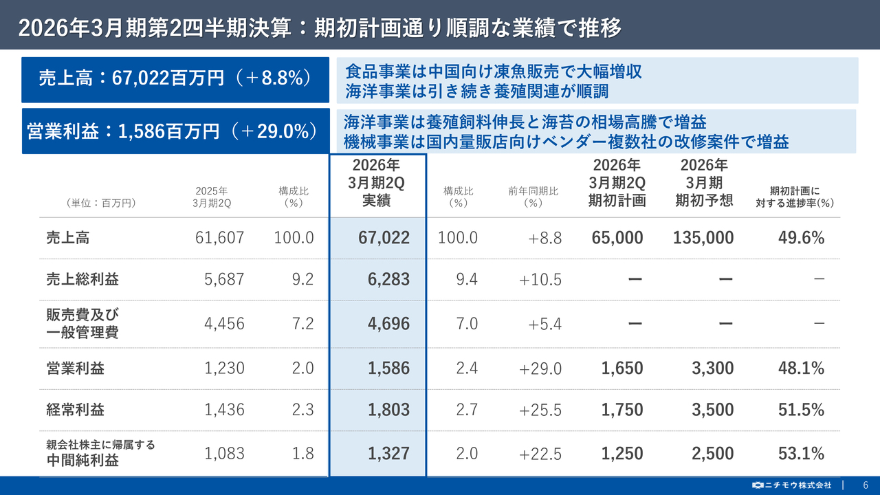 次に、第2四半期の決算の具体的な数値ですが、売上高は、食品事業の中国向け凍魚販売が大きく伸長したことや、海洋事業が引き続き養殖関連の販売が堅調に推移した結果、670億2,200万円と前年同期比8.8パーセントの増収となりました。