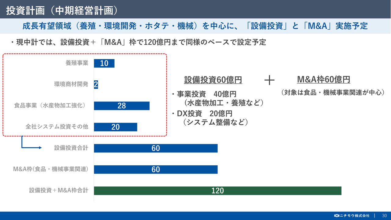中計期間においては、総額120億円の投資枠を設定し、設備投資・M&Aをそれぞれ60億円の配分としています。