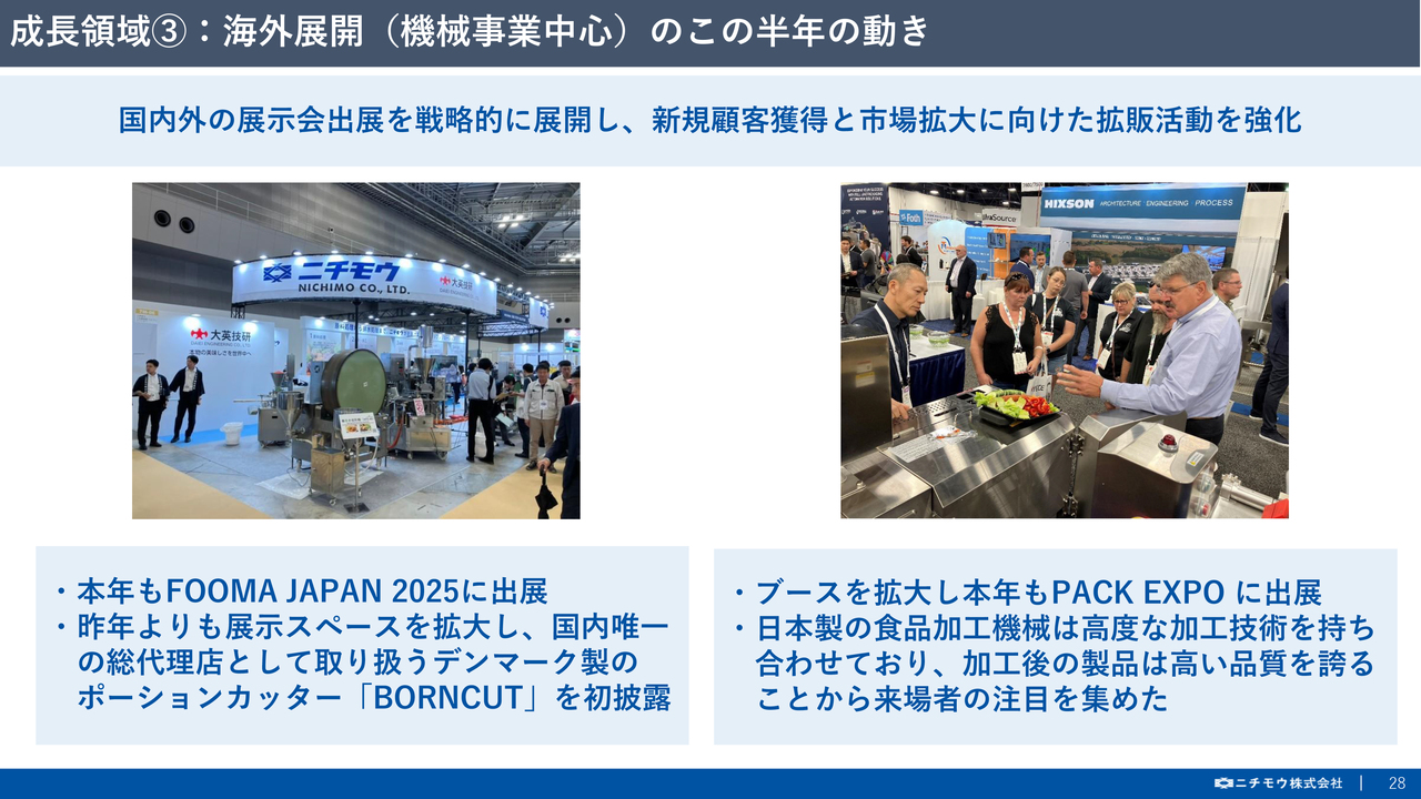 海外展開の半年間の動きとしては、機械事業において国内外の展示会へ積極的に出展し、新規顧客の獲得と市場拡大に向けた拡販活動を強化しています。