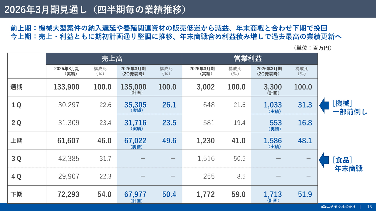 一方、下期は一部の案件が前倒しで納入した機械事業において、いかに中小型案件を確実に獲得できるかという点と、かき入れ時となる年末商戦で食品事業において利益をどこまで積み増しできるかという点が最大のポイントとなりますが、取りこぼしがないよう、しっかり業績管理に努めていきます。