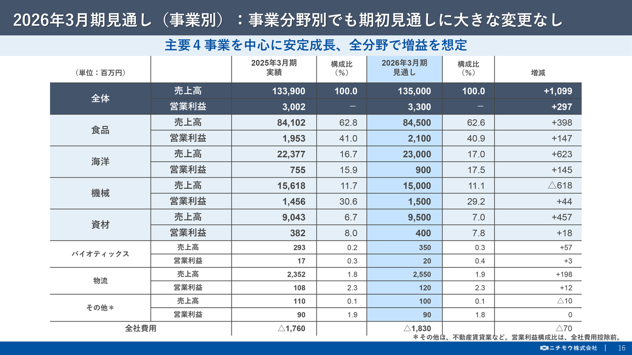 2026年3月期見通し(事業別):事業分野別でも期初見通しに大きな変更なし