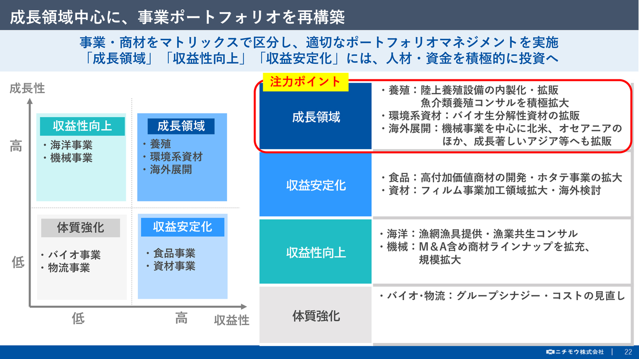 全事業の中でも、特に注力する事業および商材が、成長領域に区分した「養殖」「環境系資材」「機械事業を主軸とする海外展開」の3つとなります。