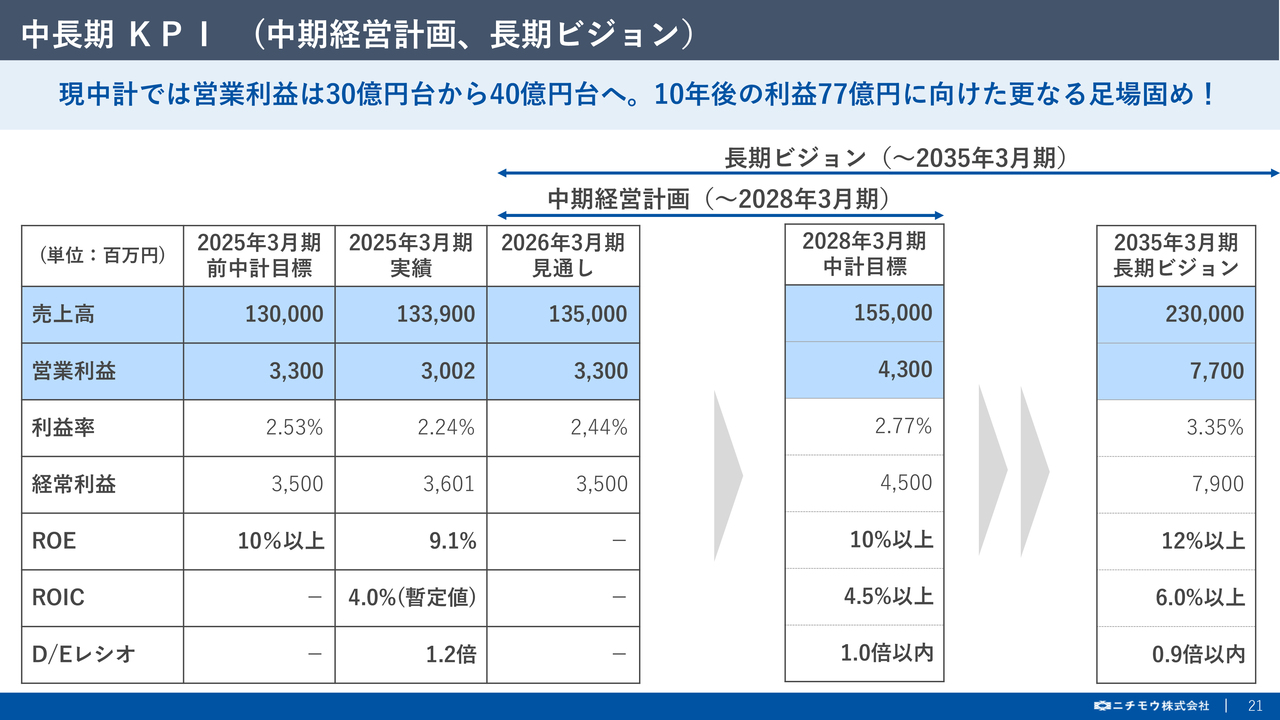 この大きな目標の達成に向けて、前中計において営業利益30億円台の土台作りが整備できましたので、現中計の3年間では営業利益を40億円台へと一段引き上げ、その後の大きな飛躍へ向けたさらなる足場固めを行っていきます。