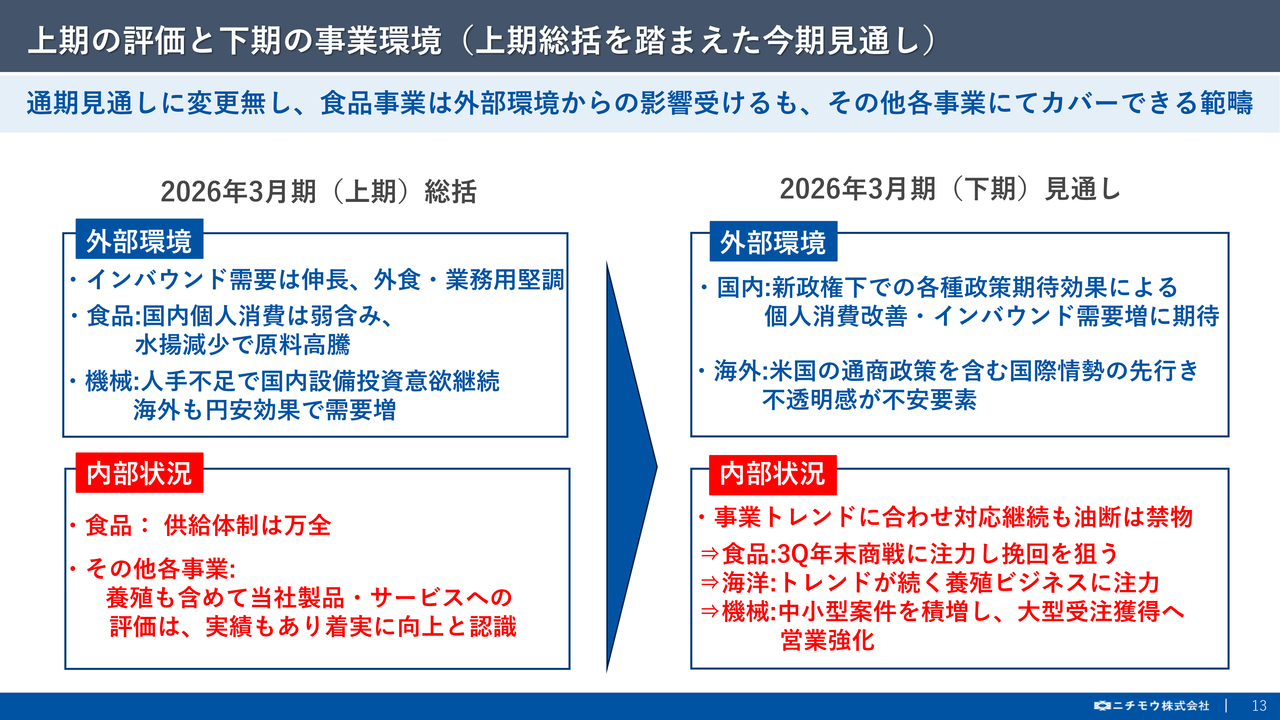 また、上期の国内消費は、物価上昇に加えて、水産物の原料高騰等により個人消費は弱含みで推移しましたが、下期は新政権下での各種政策効果を受けて、個人消費は改善していくのではないかと考えています。