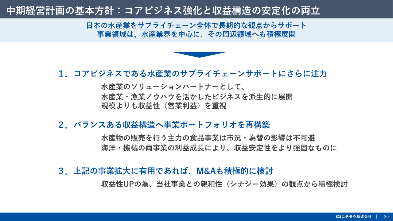 続いて、中計の基本方針ですが、1つ目が、コアビジネスである水産業のサプライチェーンに対し、ソリューションパートナーとしてサポートに注力していきます。