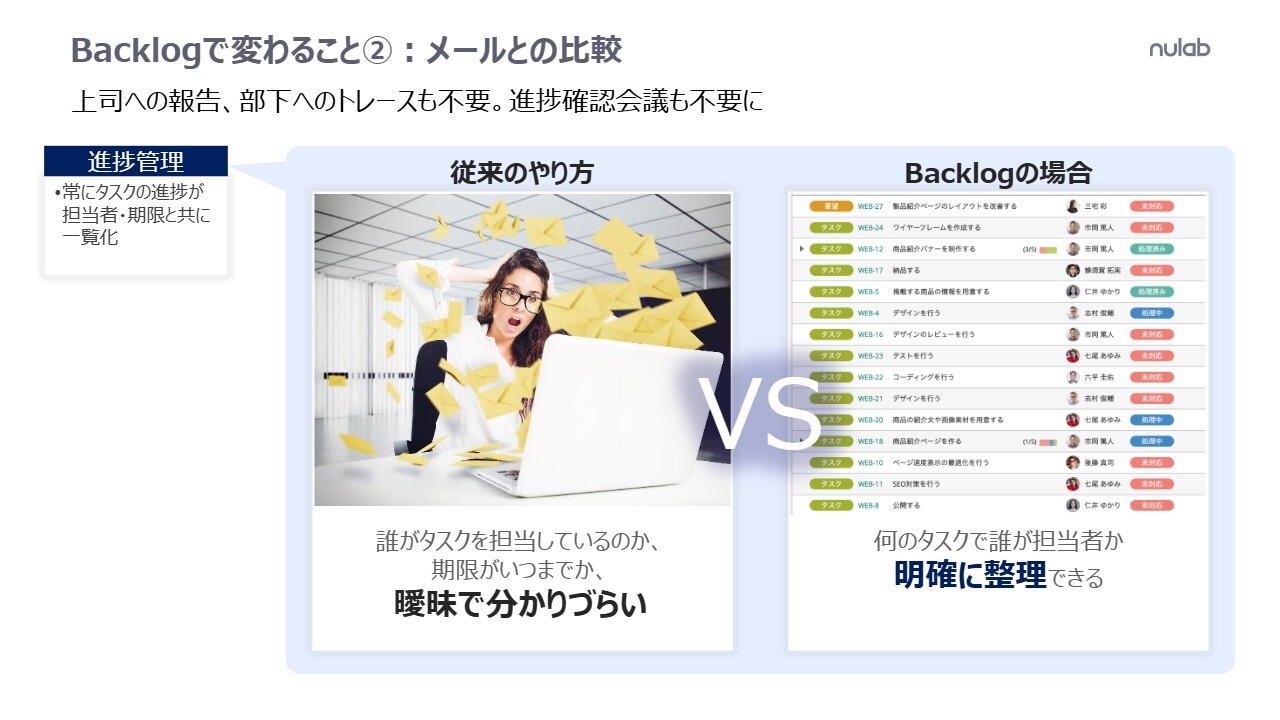 「Backlog」を使うことで、誰がどのタスクを担当しているかを明確に整理でき、情報を集約して常にプロジェクトメンバーに共有されている状況を整えることが可能です。