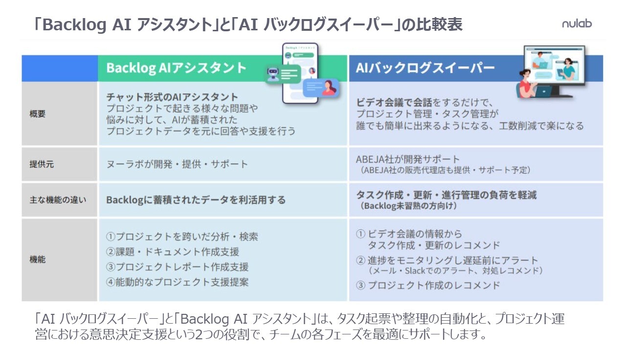 「Backlog AI アシスタント」と「AI バックログスイーパー」の比較表