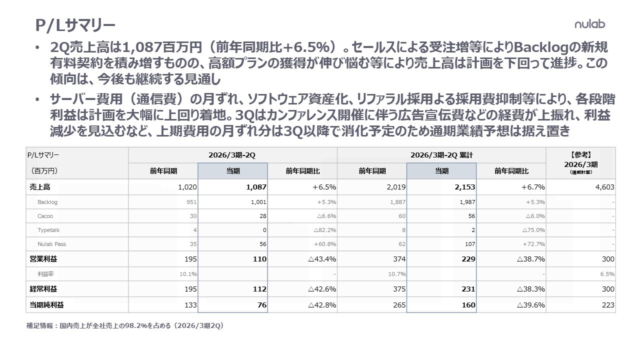 P/Lサマリーの左側をご覧ください。第2四半期は売上高が10億8,700万円で、前期比6.5パーセントの増加となりました。営業利益は1億1,000万円となりました。以下の詳細は記載のとおりです。