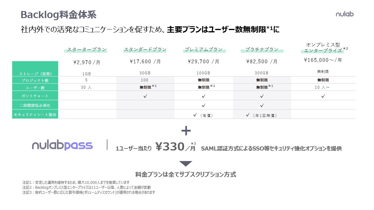 また、大企業などツール導入時にセキュリティ面を重視する企業に対しては、セキュリティ強化オプション「Nulab Pass」を組み合わせていただくことで、提供価値をさらに大きくすることができます。