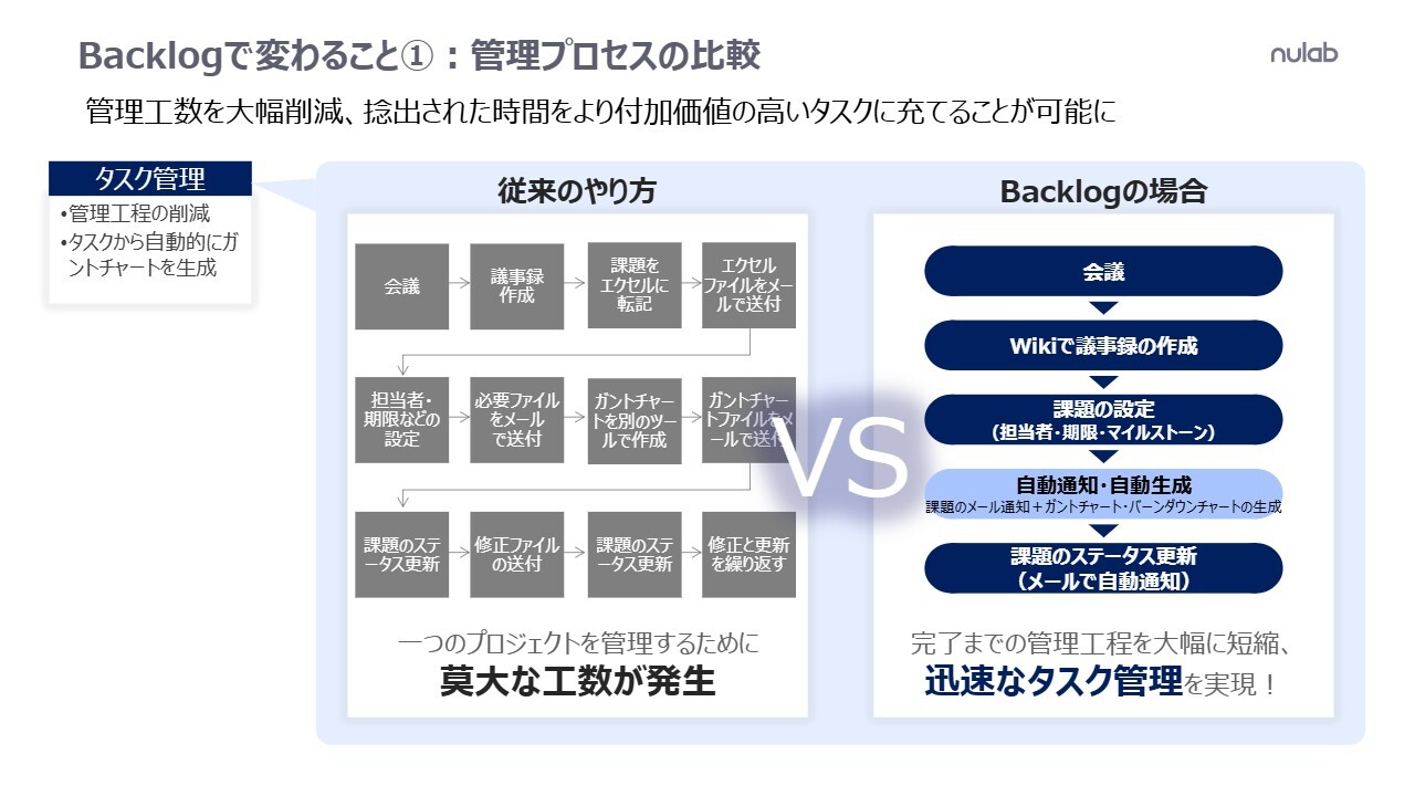 「Backlog」の機能を使用することで、従来の方法と比較して大幅に工数を削減でき、その分の時間をより付加価値の高いタスクに多く割り当てることが可能になります。