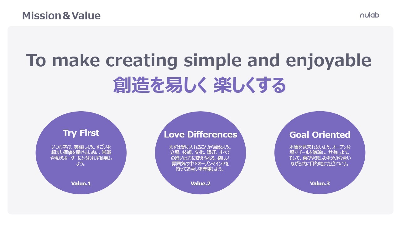 当社は「To make creating simple and enjoyable」をミッションに掲げ、「Try First」「Love Differences」「Goal Oriented」という3つのバリューを中心に据えています。