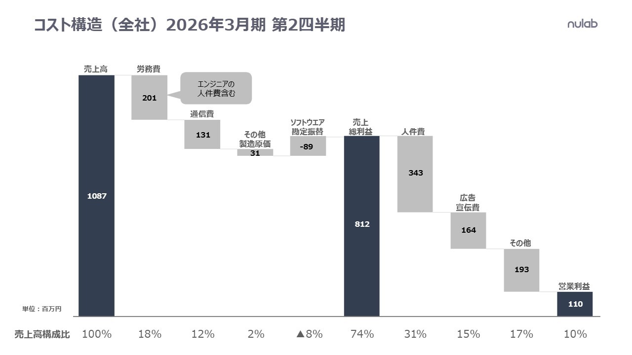 第2四半期のコスト構造です。コスト構造は、労務費を含む人件費、通信費、広告宣伝費が大きな割合を占めています。採用の増加に伴い人件費の割合が増加しましたが、先ほどお伝えしたとおり、AIに関する製品開発が進み、ソフトウェア資産化が進んだ結果、売上総利益を上振れさせる要因となっています。