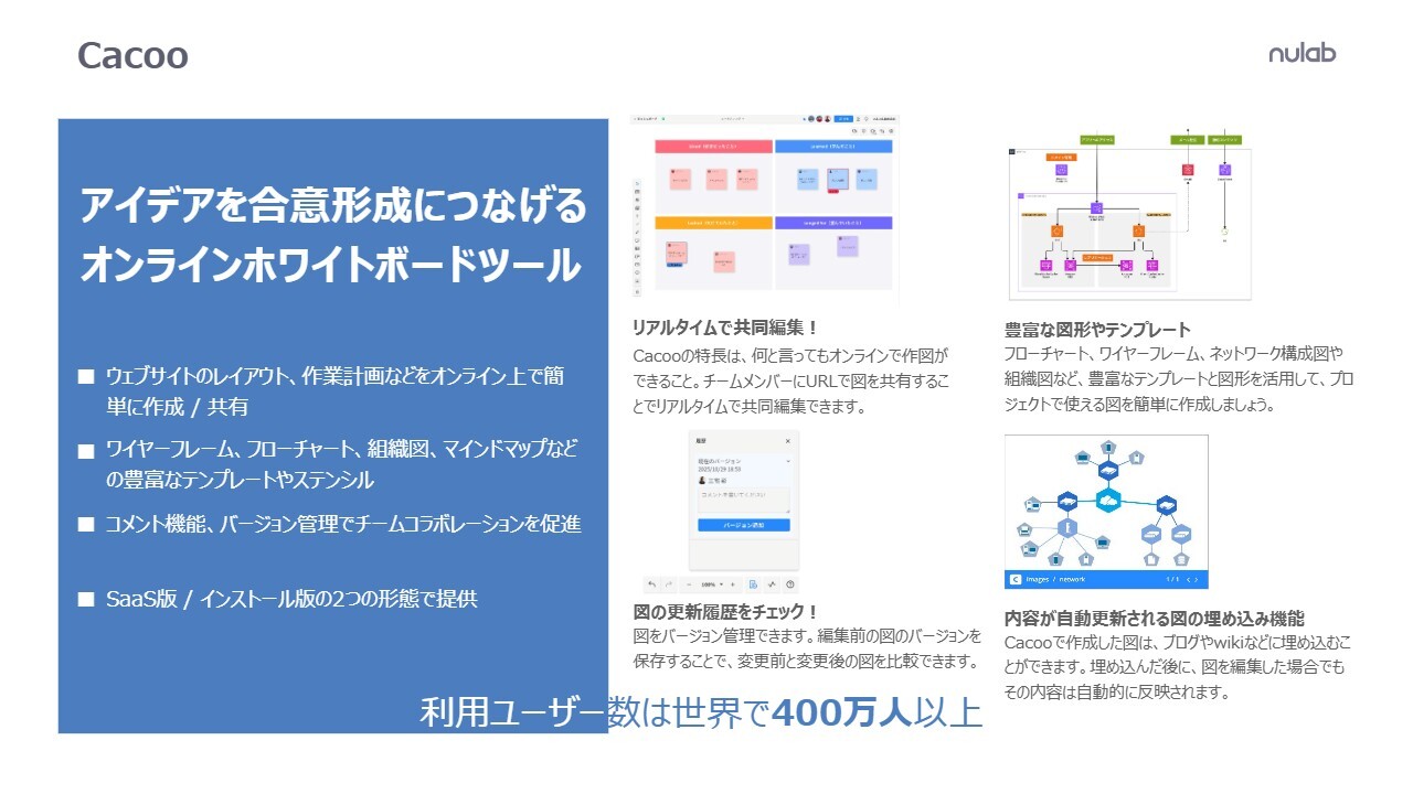 「Cacoo」についてご説明します。「Cacoo」は誰もが使えるシンプルな機能を備え、チームのアイデア共有を加速するクラウド環境のビジュアルコラボレーションツールです。豊富なテンプレートやバージョン管理機能を活用して、チームのコラボレーションを促進します。