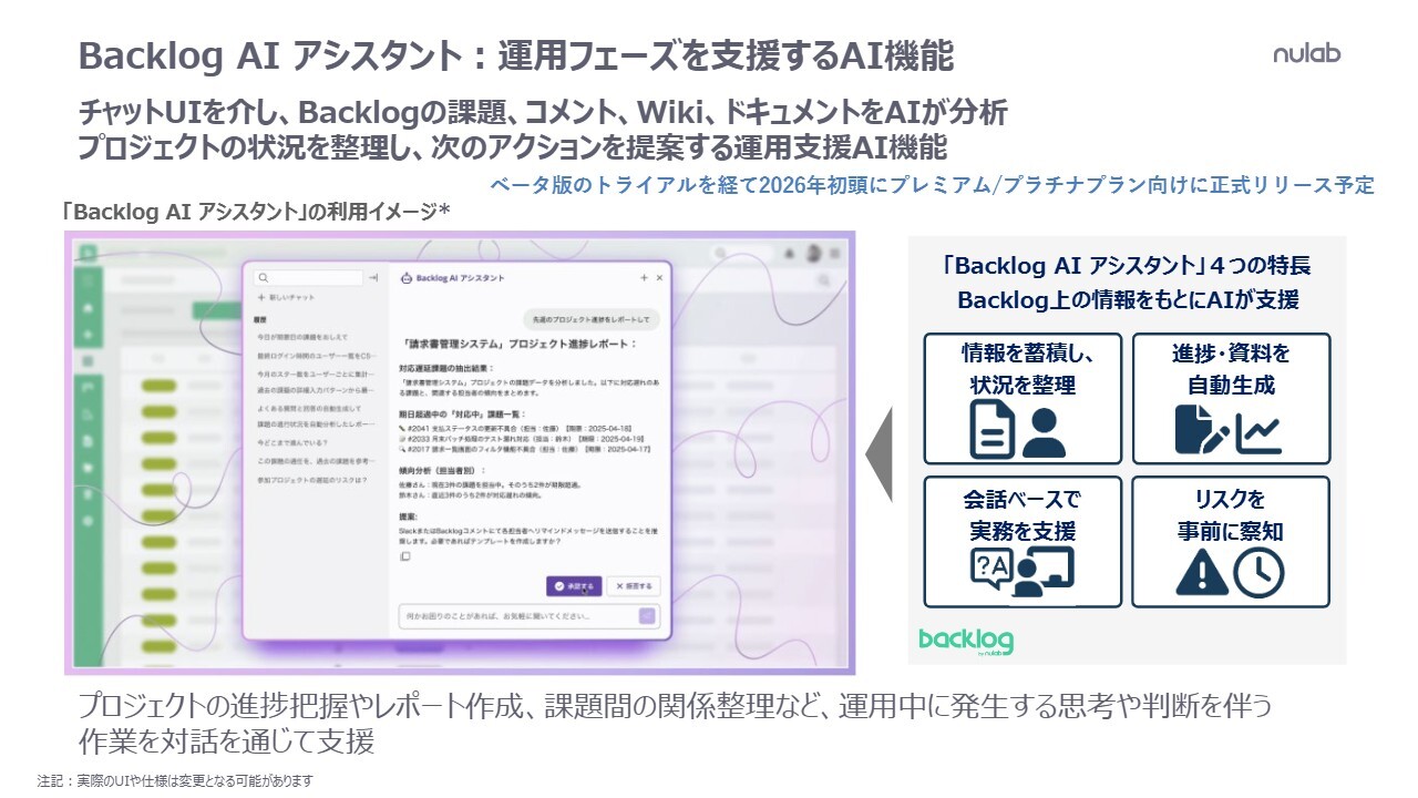この構想に向けた具体的な布石として、2026年初頭のリリースを予定しているのが、「Backlog AI アシスタント」です。