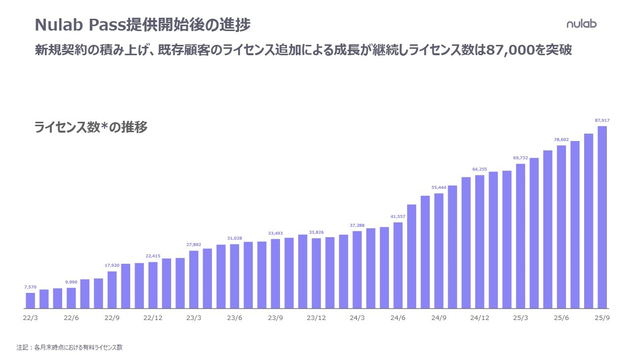 「Nulab Pass」の状況ですが、好調が続いています。「Backlog」新規導入顧客に対するセールスチームの提案活動などにより、引き続きライセンス数を順調に伸ばしており、9月末時点で前四半期より9,000ライセンス増加し、8万7,000ライセンスを突破しています。
