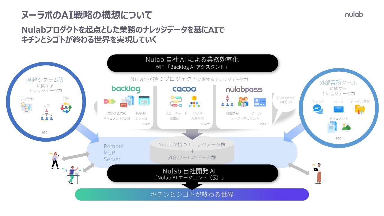 「Nulab AI エージェント」は、「Backlog」や「Cacoo」に集約されたコミュニケーション、および実務データの蓄積によって機能します。